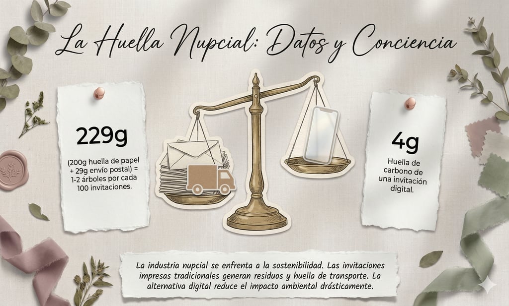 Desde una perspectiva analítica, el contraste es demoledor. Una sola invitación de papel genera 200g de CO2, a los que deben sumarse 29g adicionales por la logística del envío postal. Multiplicado por el promedio de invitados, el legado ambiental es alarmante.