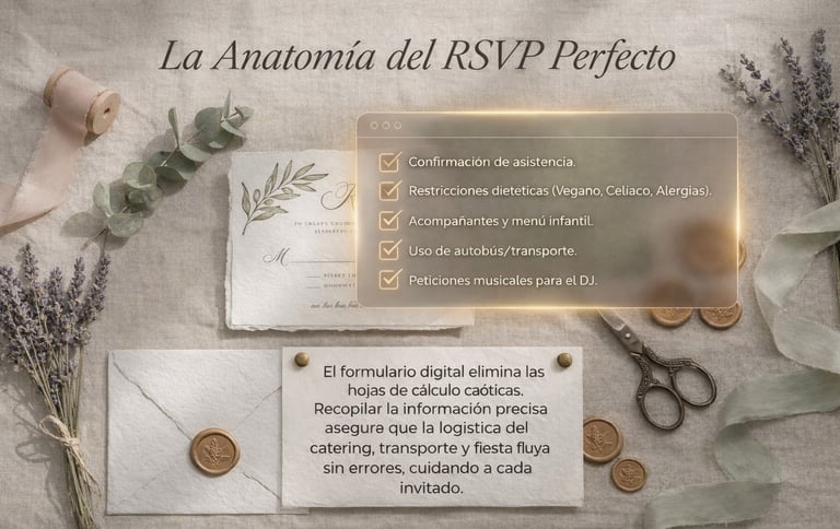 Para que una invitación funcione como una herramienta de análisis, debe integrar un formulario RSVP que alimente directamente el ecosistema logístico. Basándonos en las arquitecturas de Letter2you y Specially Love, el objetivo es capturar datos que eliminen los silos de información y aseguren una fluidez operativa inmediata.