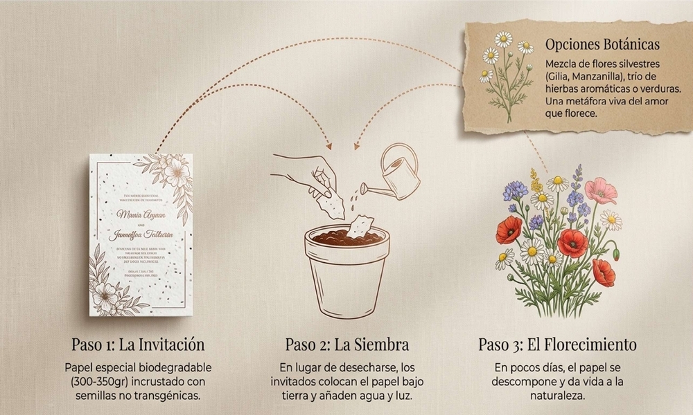 Invitaciones de boda ecológicas 2026: El lujo del papel que florece