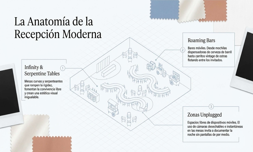 El banquete ya no es una estructura rígida. Las Infinity Tables (mesas con formas serpenteantes o curvas) están rompiendo las jerarquías tradicionales. Hacen que la gente interactúe más y que el espacio se vea dinámico.